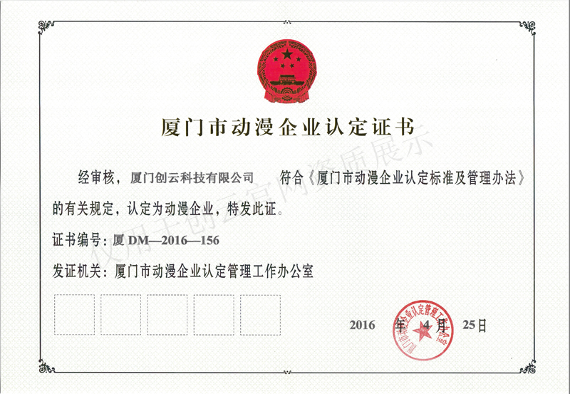 廈門(mén)市動(dòng)漫企業(yè)認(rèn)定證書(shū)