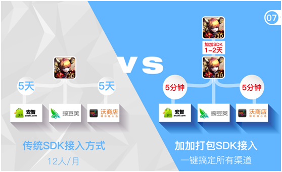 首先,我們先來了解下一鍵打包功能。傳統(tǒng)SDK接入方式費(fèi)時(shí)費(fèi)力,cp在對(duì)接一款渠道需要耗費(fèi)3-4天,并且渠道最終掌控著玩家。相比之,使用加加打包助手,只需一次性接入加加SDK,就可一鍵搞定所有的渠道包,且終生受用。